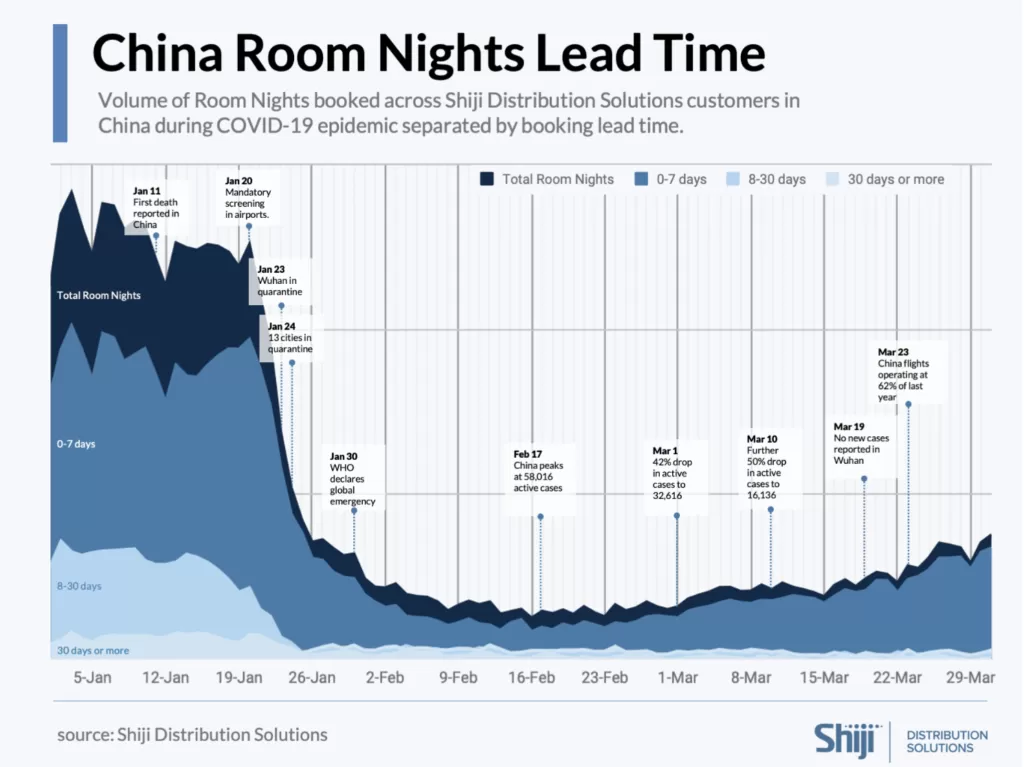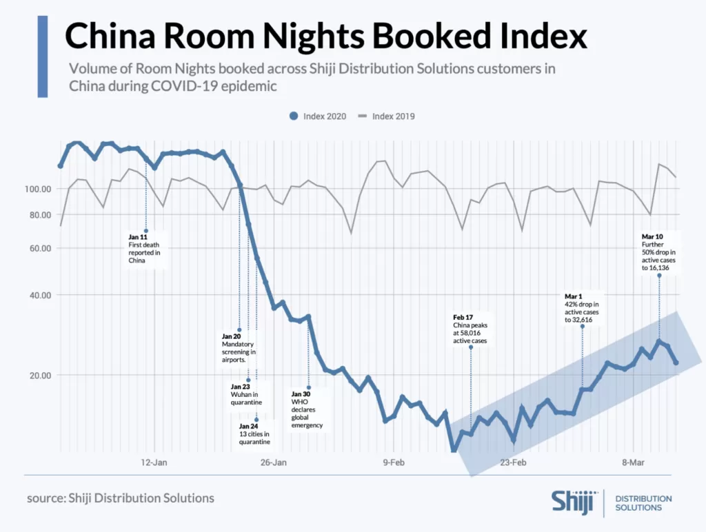 China, where this epidemic began, is interesting to observe because the country is managing this crisis 1 to 2 months ahead of Europe, which is itself about 1 month ahead of America (what about Africa?). Shiji (Chinese technology group for “hospitality”) has published a study concerning the Chinese hotel industry which draws out two interesting points: