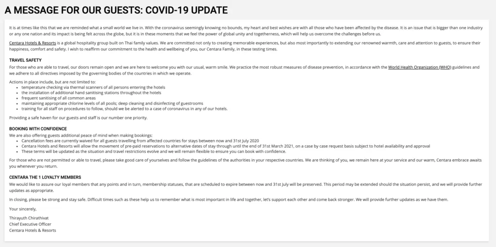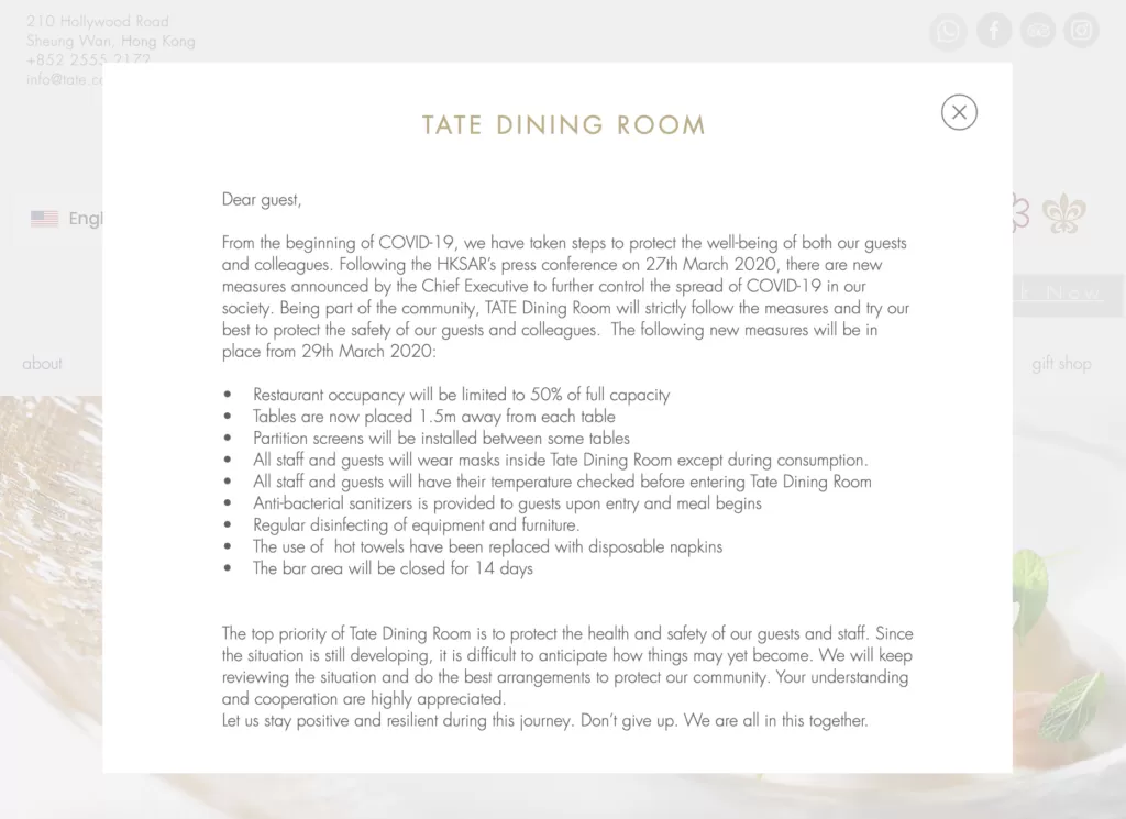 The hotel and restaurant industry players in Asia are also interesting to study in terms of the measures taken to reassure their customers. For example, the Thai group Centara Resorts or the starred restaurant Tate in Hong Kong are communicating on their websites what measures have been taken: